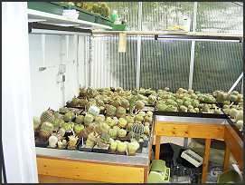 Zunächst reichte das Häuschen platzmäßig vollständig aus, aber bald wurde es (bei wem ist das anders??) eng! Zunächst spezialisierte ich mich immer mehr auf die Setacei (Ich habe heute nur noch einzelne Pflanzen aus anderen Gattungen oder Serien!), im Jahre 2000 oder 2001 (?) habe ich dann die Aufstellung geändert und entsprechende neue Tische gebaut. Die Untergestelle sind aus Holz (das ist sicher ein bisschen klobiger als aus Aluminium), oben drauf habe ich mir 5cm hohe Metallwannen anfertigen lassen. So kann ich jetzt eine Tischtiefe/breite von 80cm nutzen.