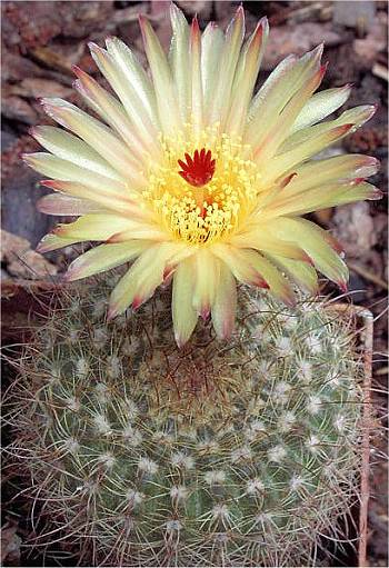 Areolen: ca. 4mm entfernt; Dornen: Randdornen 20-30, borstenartig, seitlich verflochten, gelblichgrau, biegsam; Mitteldornen: meist 4, bis 15 mm lang, davon meist einer abwärts gebogen, dunkle Spitze, am Grunde braun verfärbt.